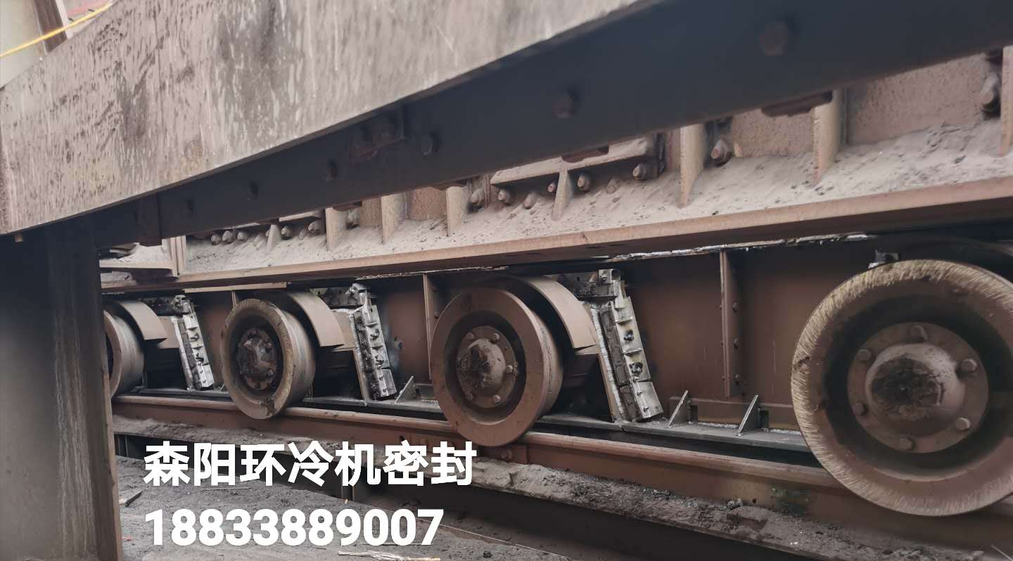 密封采用彈性可自調(diào)結(jié)構(gòu)。可根據(jù)環(huán)冷臺車跑偏情況進行彈性調(diào)整。對環(huán)冷機底梁、臺車輪、三角梁、煙罩等位置進行有效密封。煙罩部分采用水槽式密封結(jié)構(gòu),保證煙罩圈梁始終在水槽密封內(nèi)運行。密封后有效改善現(xiàn)場噴料、漏風(fēng)。改善現(xiàn)場環(huán)境,提高煙氣溫度,從而增加了發(fā)電量。